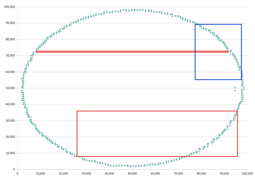 And if you try to use these inner dots as the bottom-right corner (for rectangles in the top half) or the top-right corner (for rectangles in the bottom half), you get plenty of big valid rectangles!